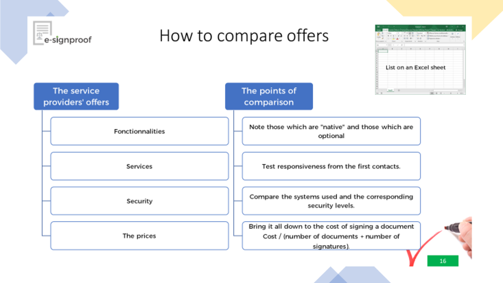 To properly compare the offers, you have to calculate the average price of a signed document and add the number of features corresponding to that price. Internet comparators only take into account a few providers (who some times have paid to be mentioned) and do not take into account the reality of the market. The comparison best suited to your case will always be the one that you have built yourself, taking into account the functionalities useful to your company according to your profession. Several providers offer specific functionalities depending on the business (this is the case of e-signproof.com).